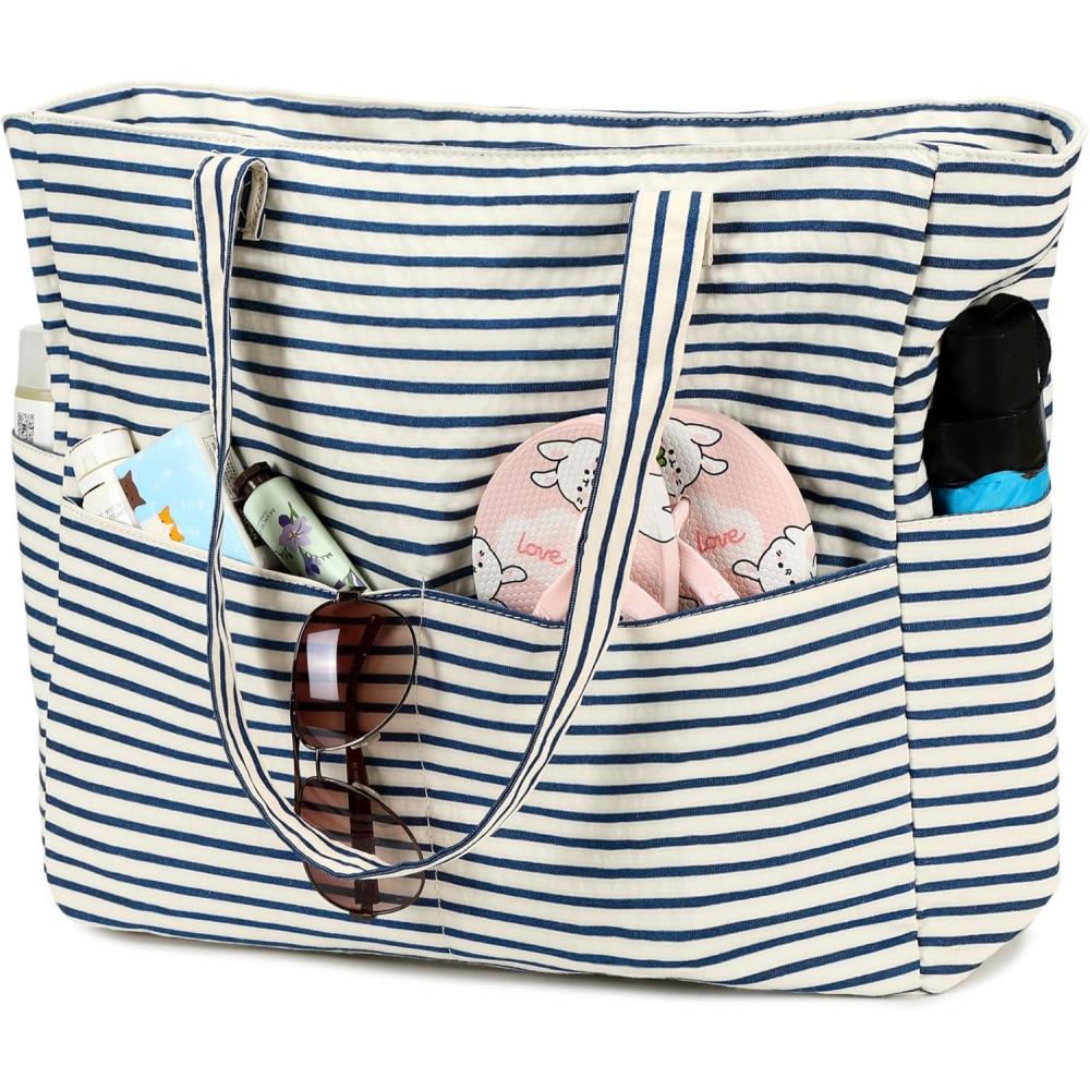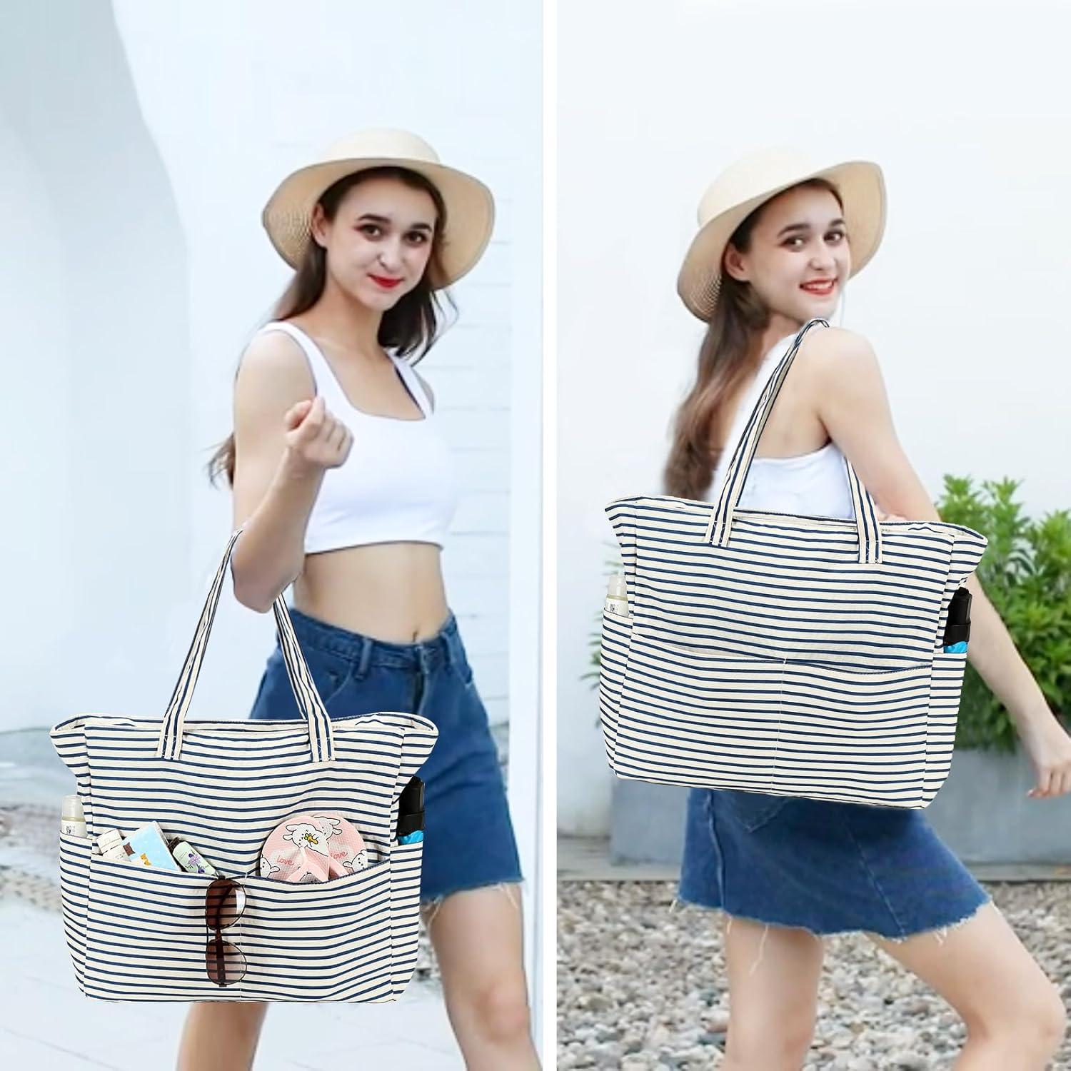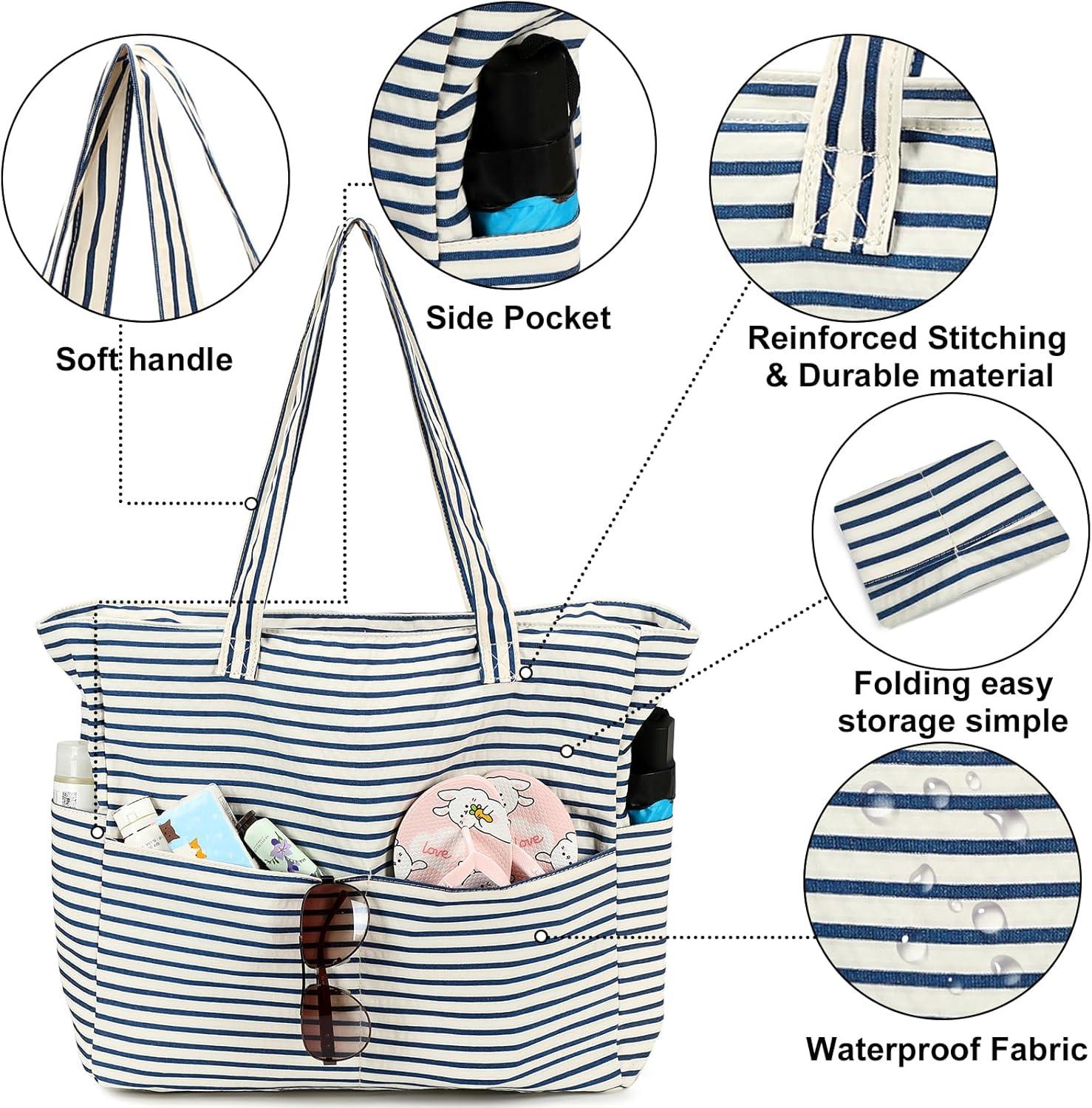 Beach Pool Bags Tote for Women Ladies Large Gym Tote Carry On Bag With Wet Compartment for Weekender Travel Waterproof(Blue Wave Stripe)