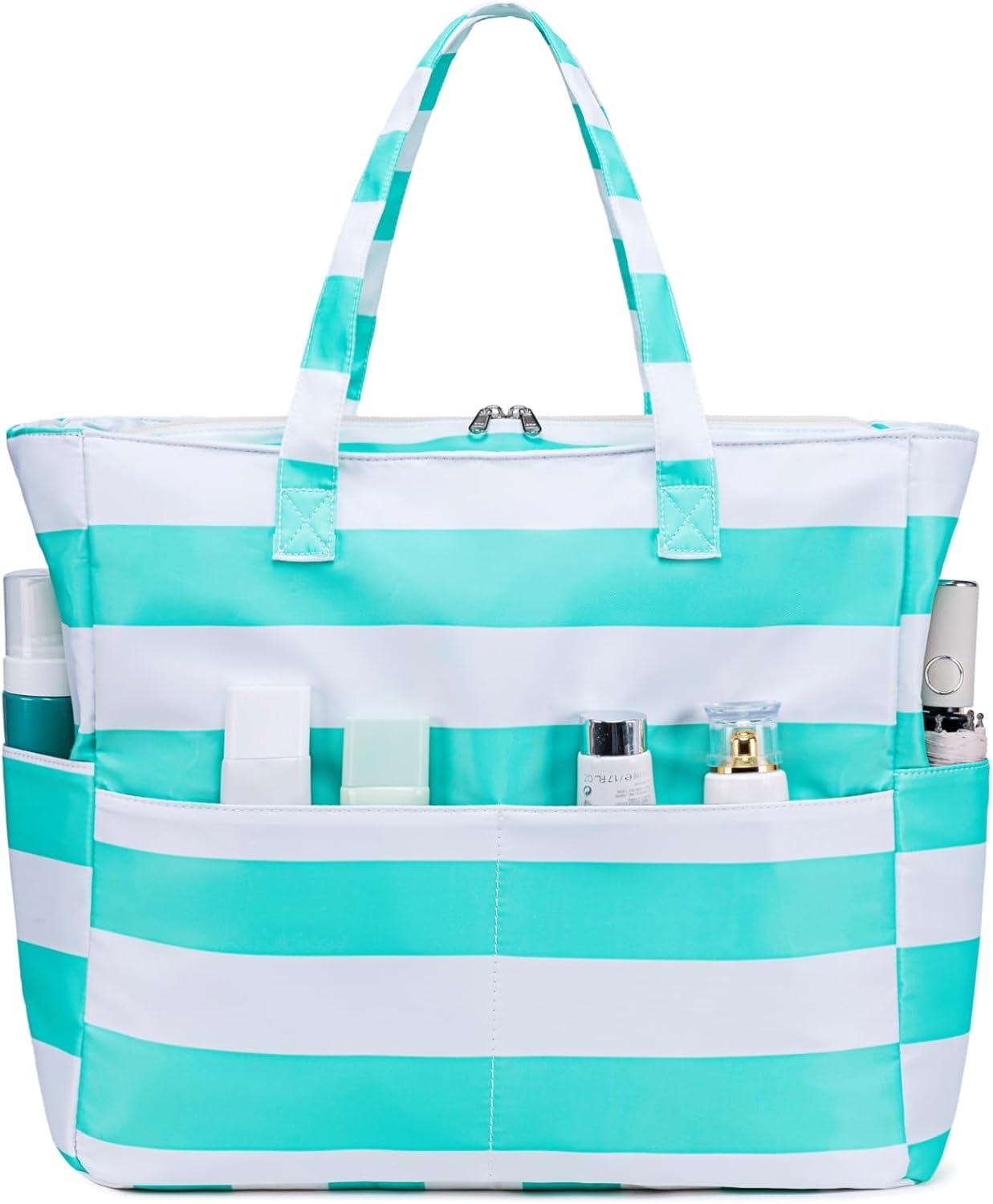 Beach Pool Bags Tote for Women Ladies Large Gym Tote Carry On Bag With Wet Compartment for Weekender Travel Waterproof(Green-white Pinstripes)