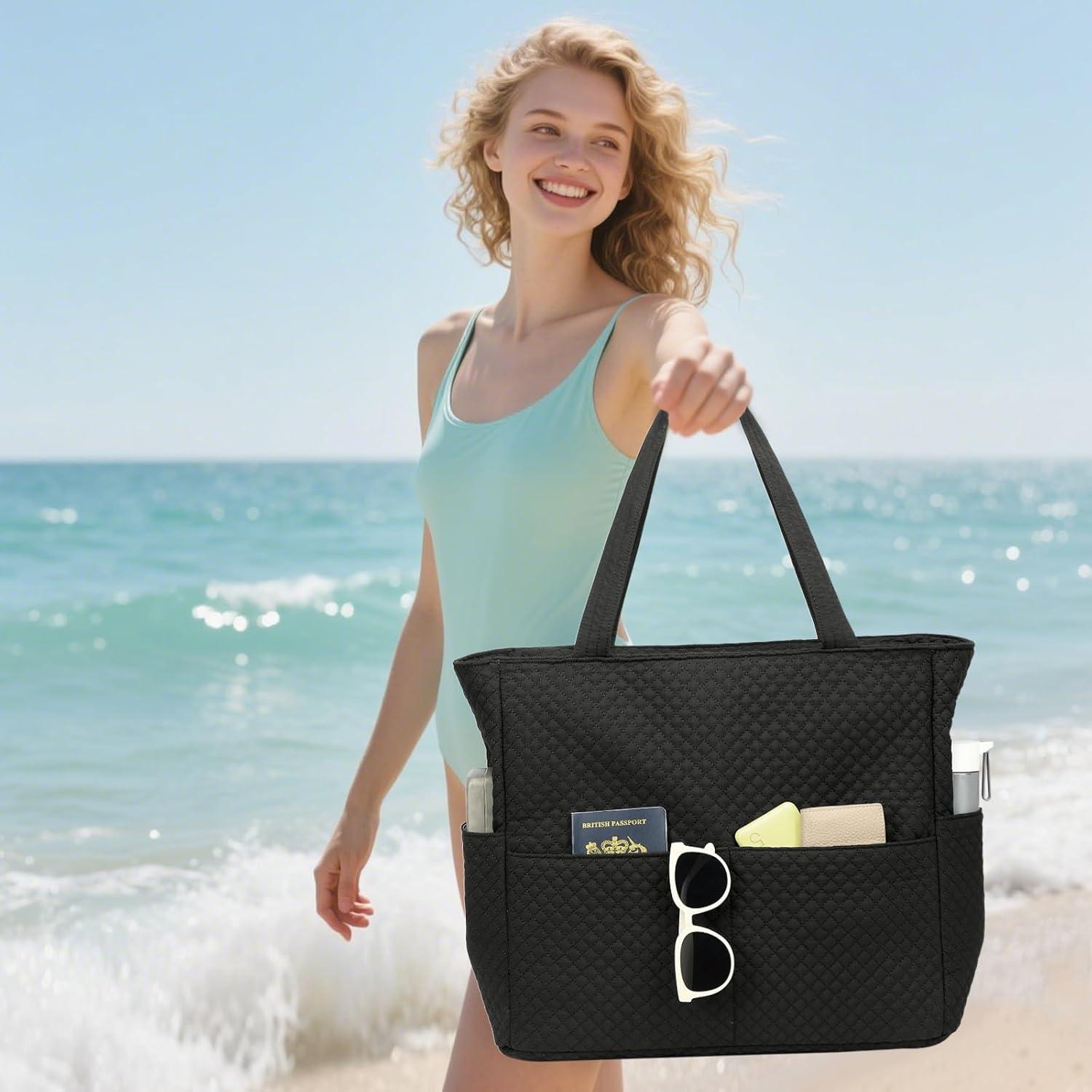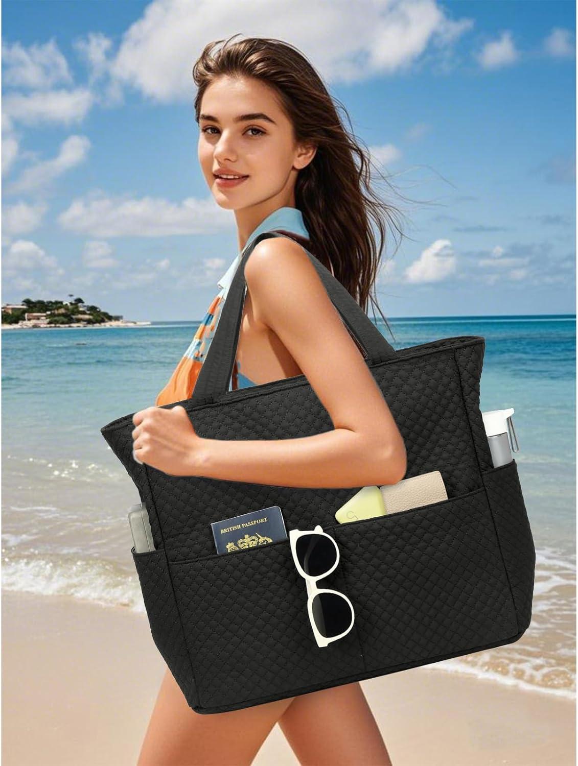 Beach Pool Bags Tote for Women Ladies Large Gym Tote Carry On Bag With Wet Compartment for Weekender Travel Waterproof(Quilted Black Small Squares)