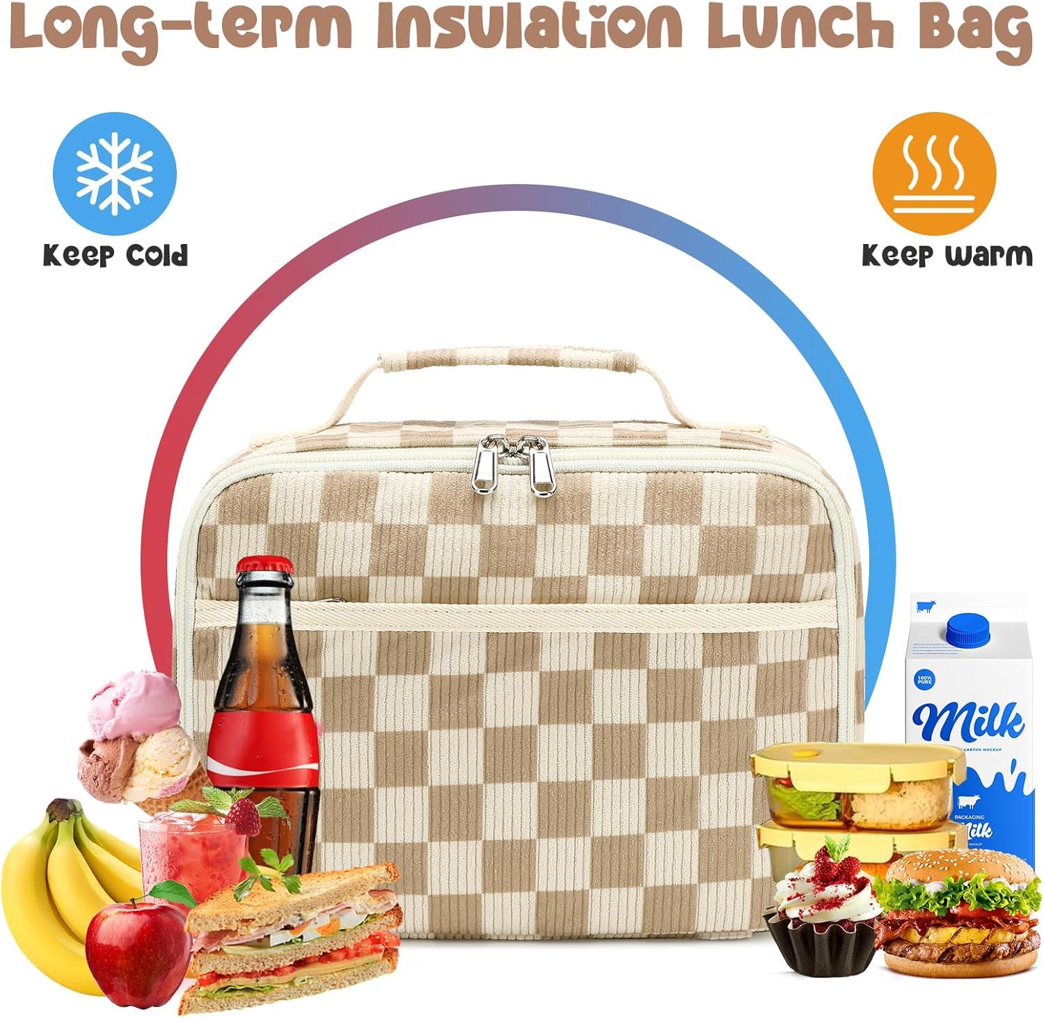Bluboon Insulated Lunch Bag for Girls & Boys, Corduroy School Lunch Box with Cooler & Organizer Compartments, Leak-Proof Lunch Tote for School, Travel (Corduroy Strawberries Beige)(Corduroy checkered brown)