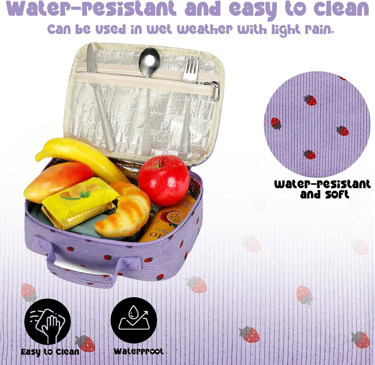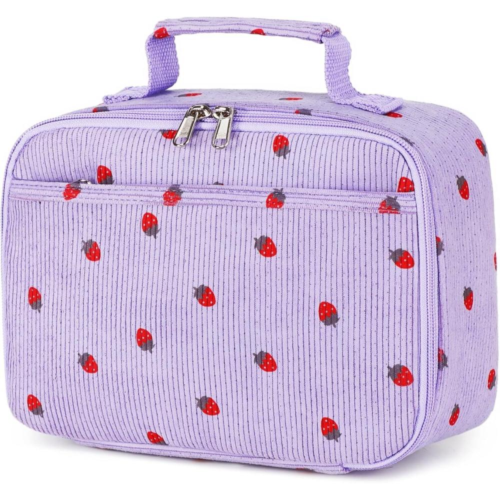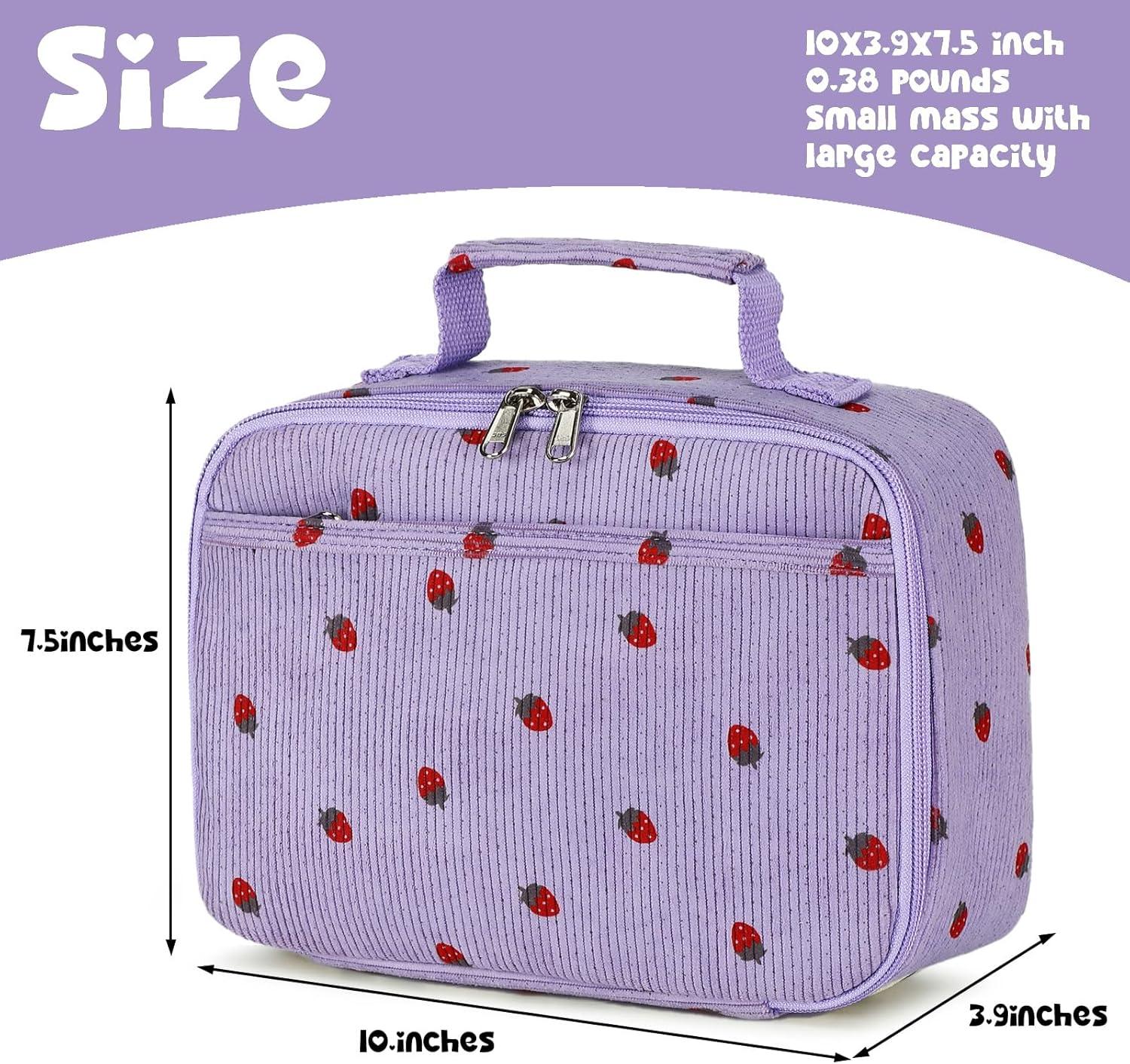 Bluboon Insulated Lunch Bag for Girls & Boys, Corduroy School Lunch Box with Cooler & Organizer Compartments, Leak-Proof Lunch Tote for School, Travel (Corduroy Strawberries Beige)(Corduroy Purple Strawberry)