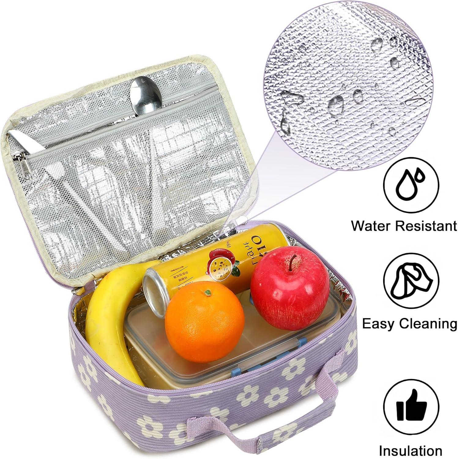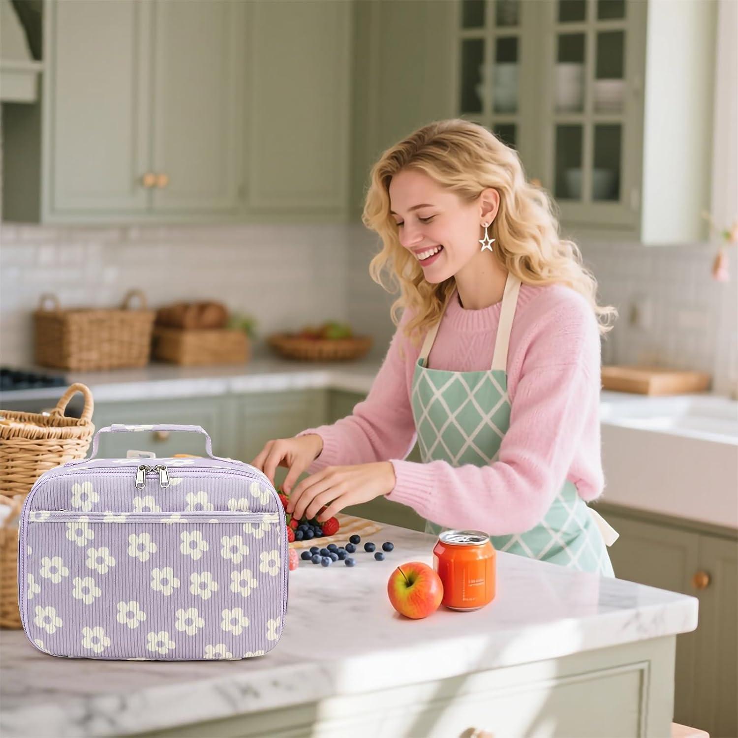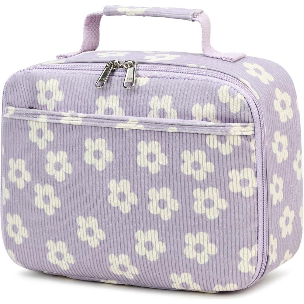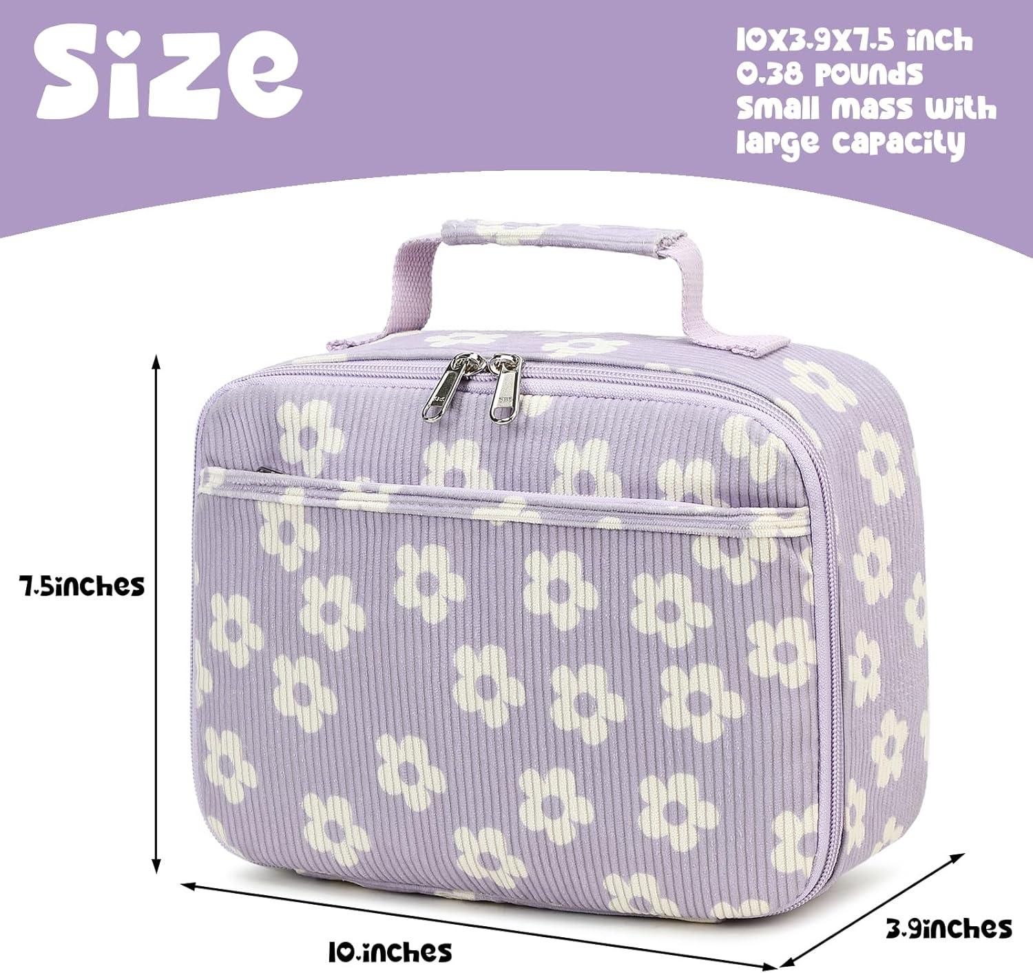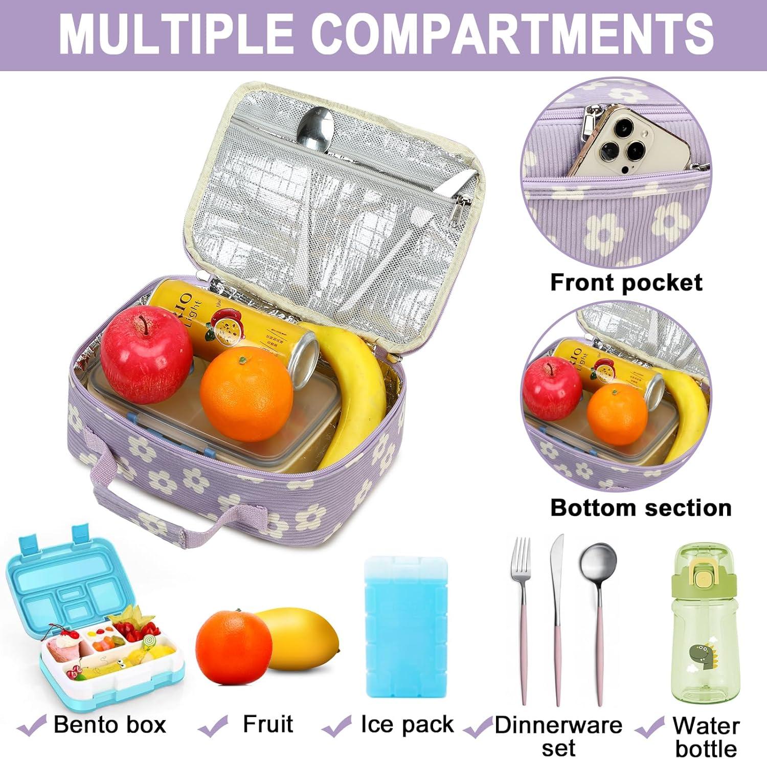 Bluboon Insulated Lunch Bag for Girls & Boys, Corduroy School Lunch Box with Cooler & Organizer Compartments, Leak-Proof Lunch Tote for School, Travel (Corduroy Strawberries Beige)(Purple flower 95)