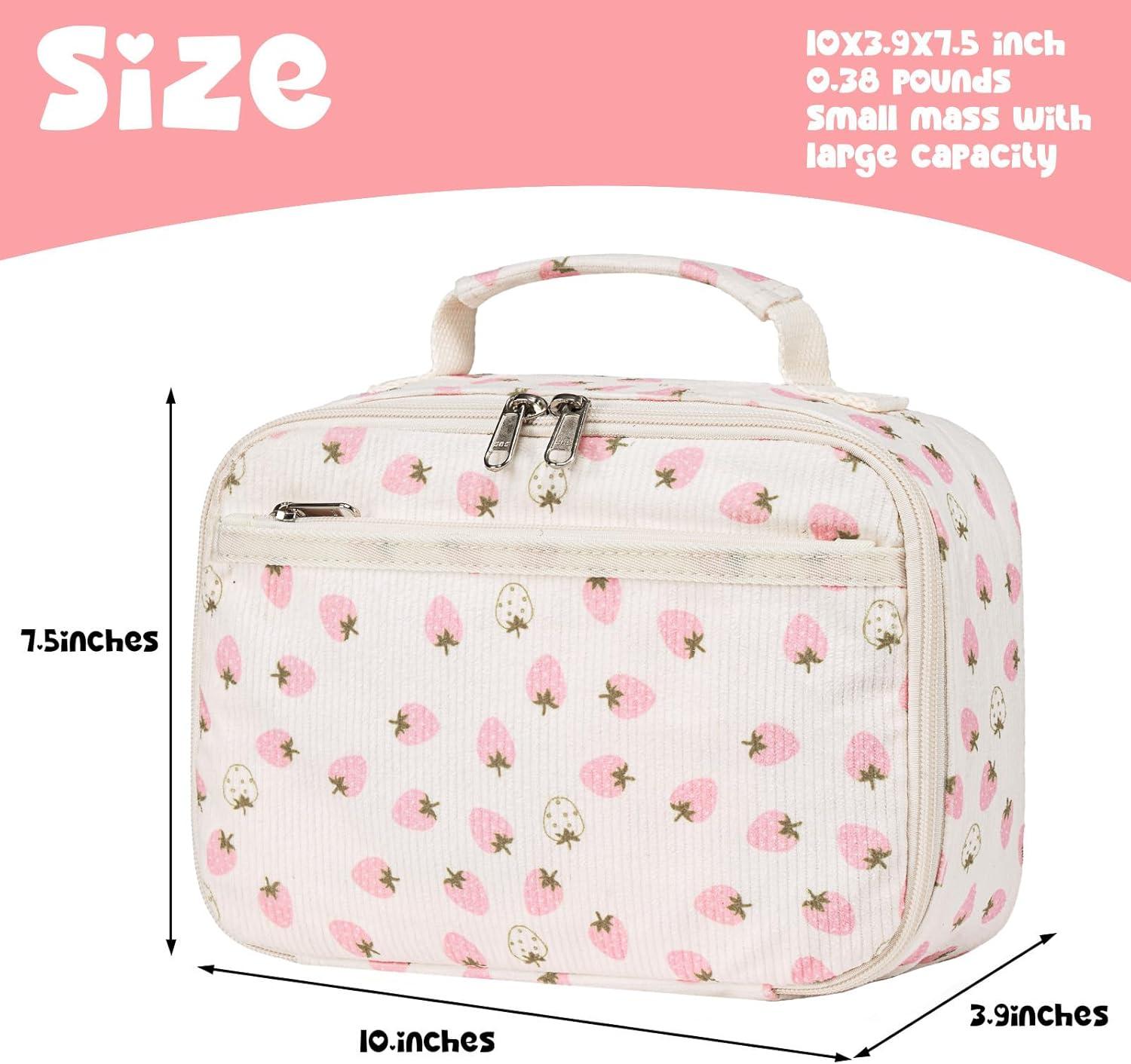 Kids lunch bag Size: 8.7″*6.3″*7.5″ (22cm* 16cm*19cm), spacious to fit two 750ml lunch containers, drinks and fruits. Insulated inside to keep your food fresh for few hours with ice packs.