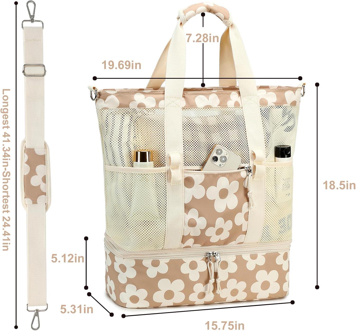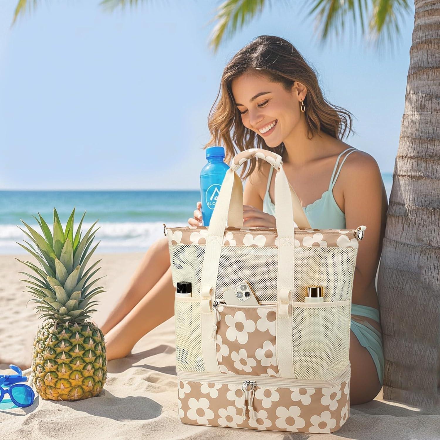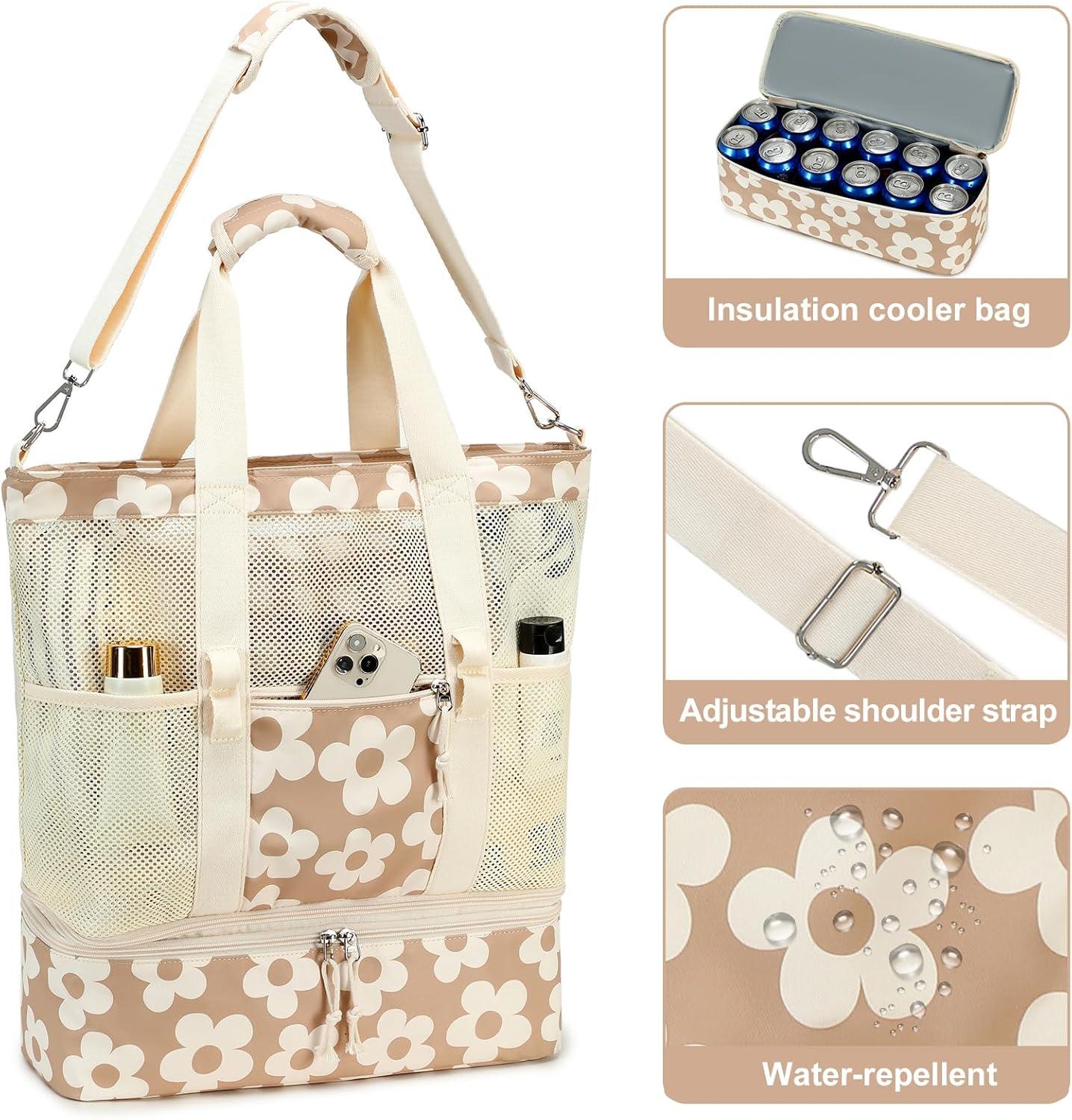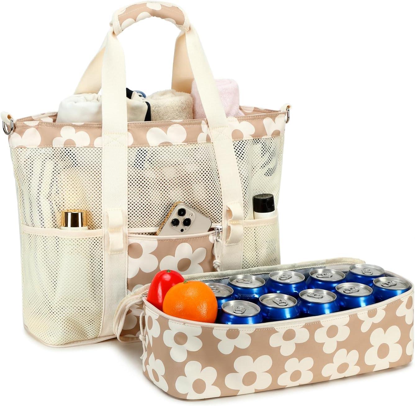 Bluboon Mesh Beach Tote Bag with Cooler Compartment Insulated Detachable Picnic Bag with Zipper and Pocket Pool Bag for Women(A-big Flower 157)