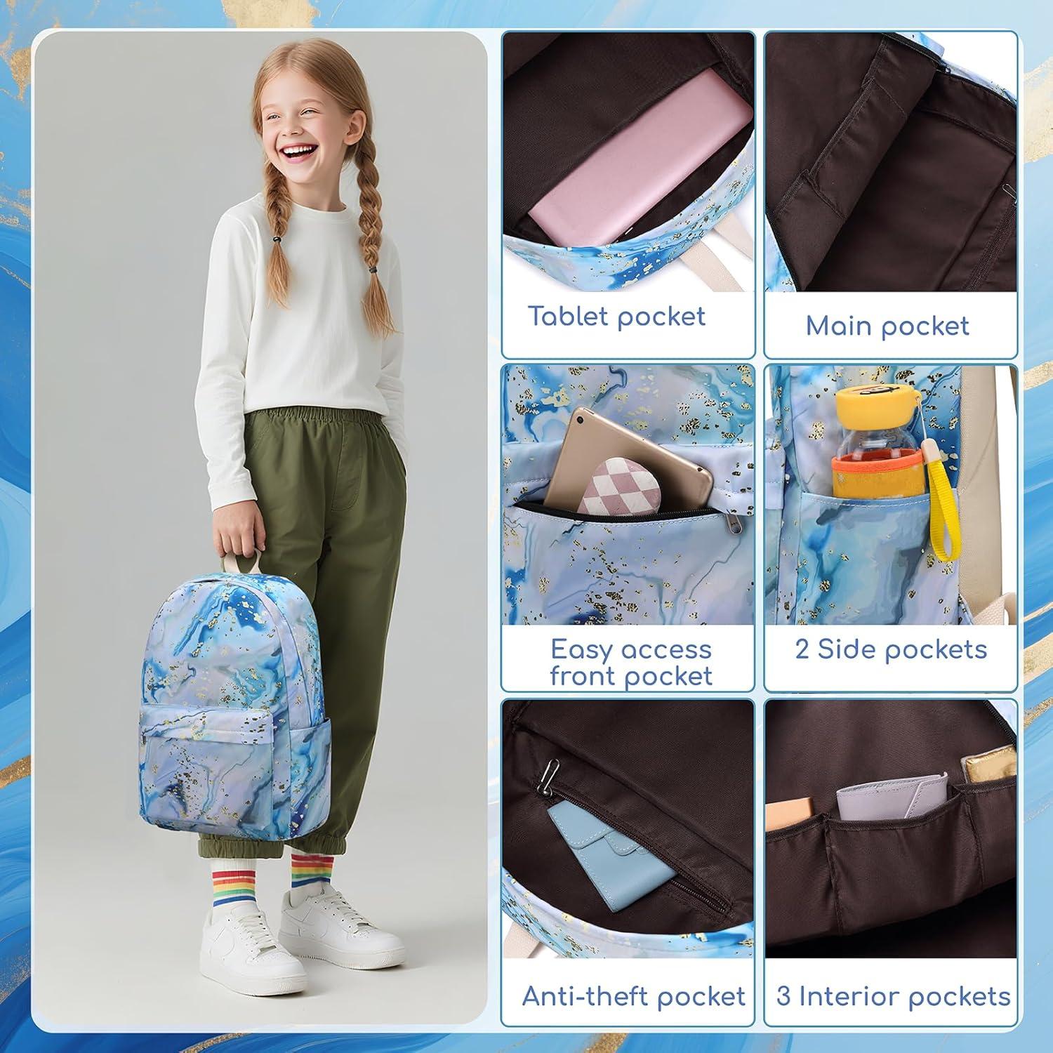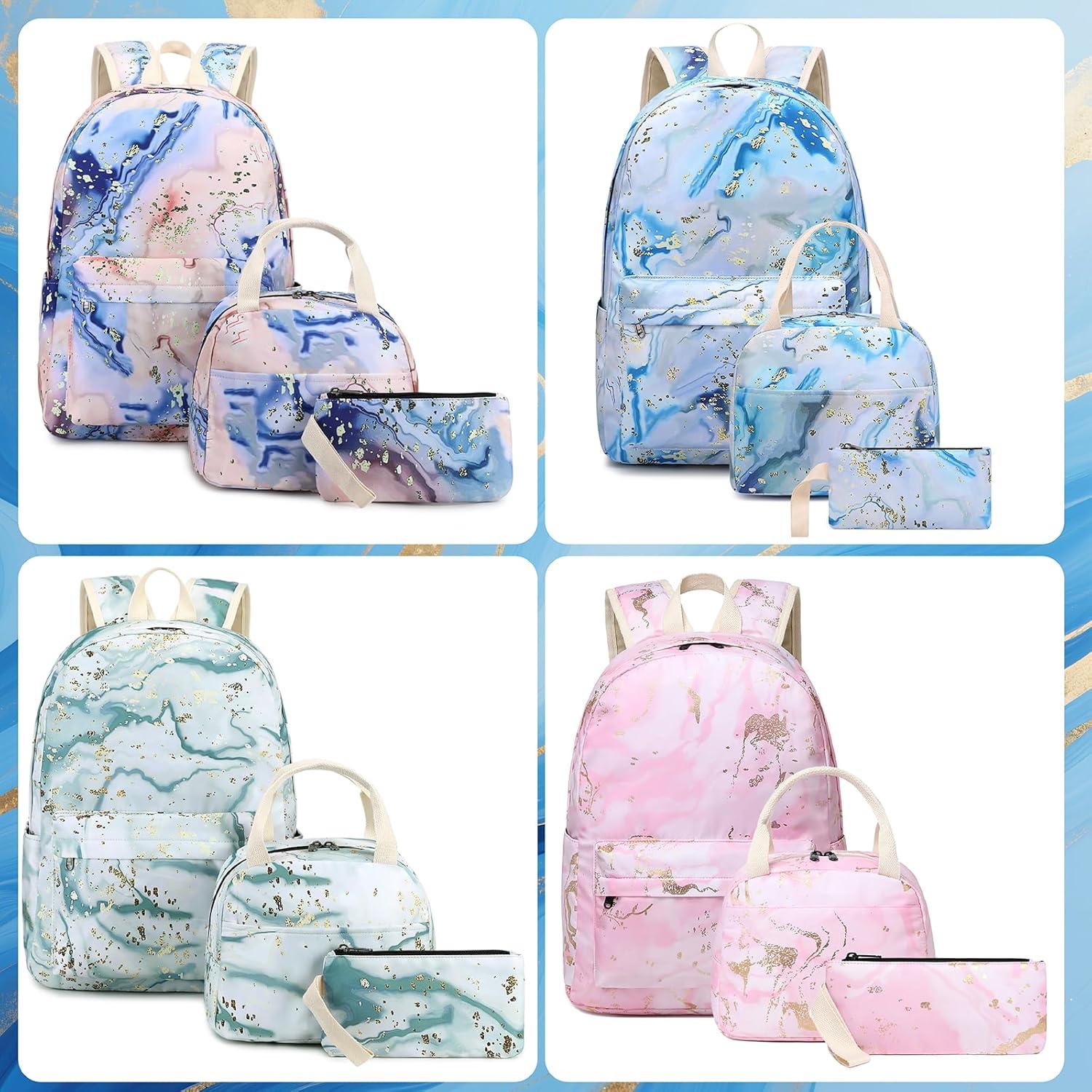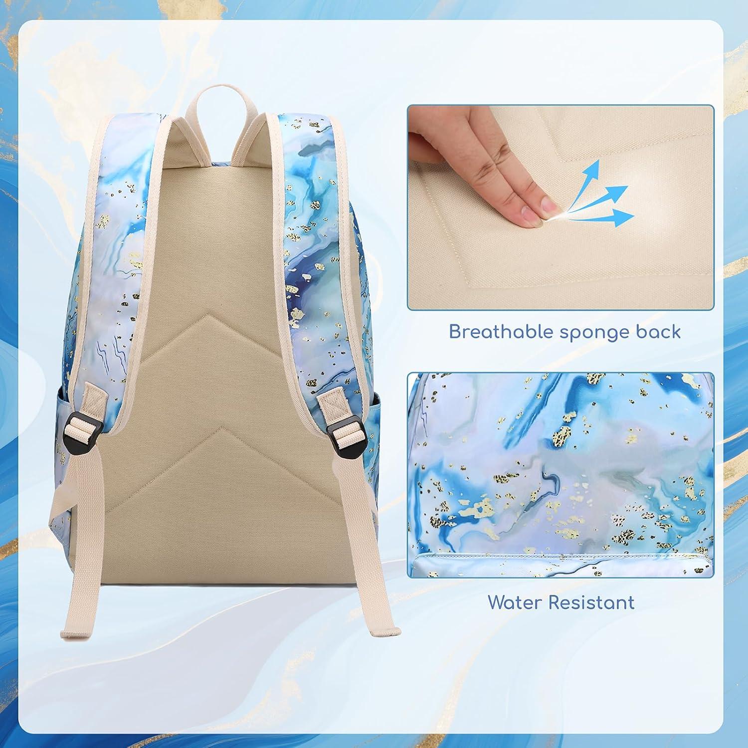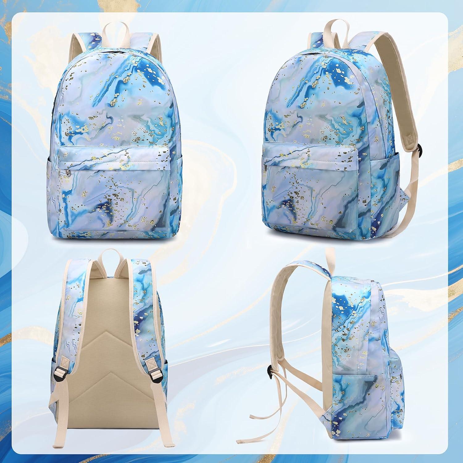 Bluboon Teen Girls School Backpack Kids Bookbag Set with Lunch Box Pencil Case Travel Laptop Backpack Casual Daypacks (Marble Pink-Blue)(Blue-white)