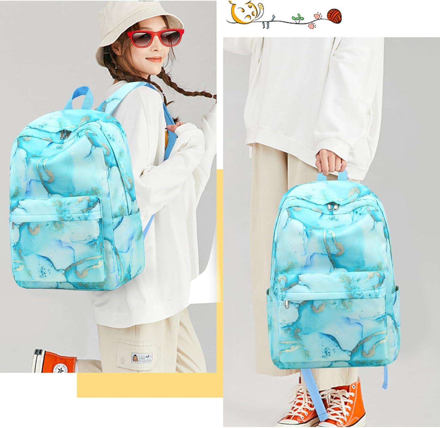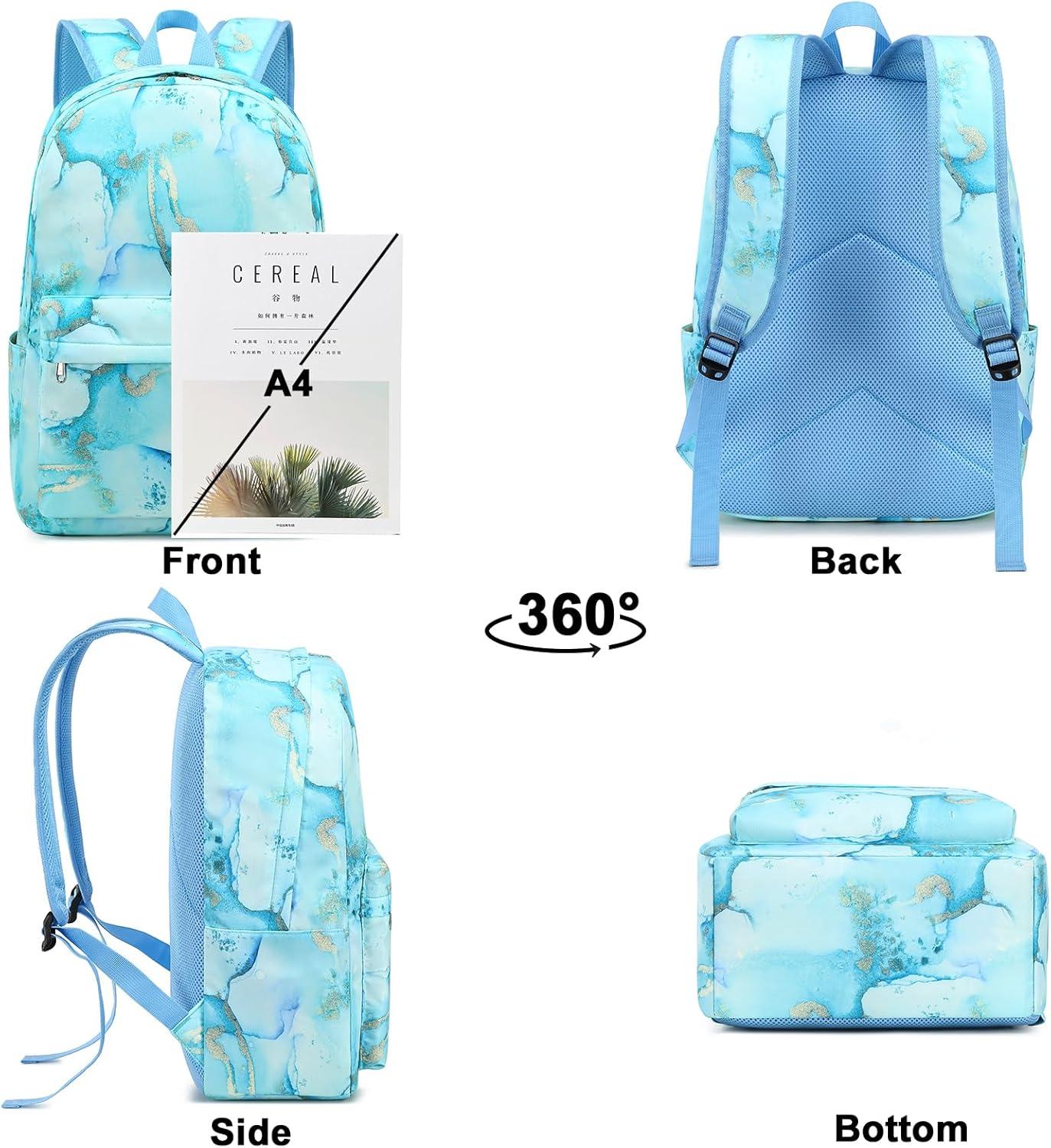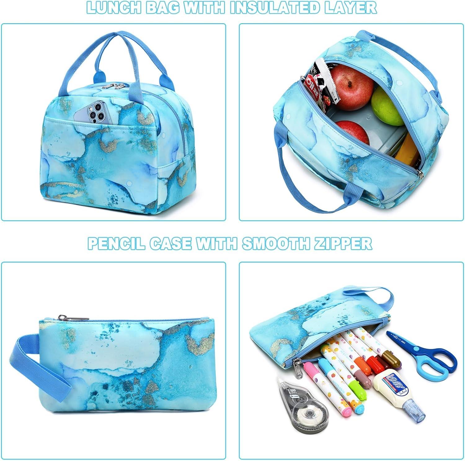 Bluboon Teen Girls School Backpack Kids Bookbag Set with Lunch Box Pencil Case Travel Laptop Backpack Casual Daypacks (Marble Pink-Blue)(Marble Gold Blue)