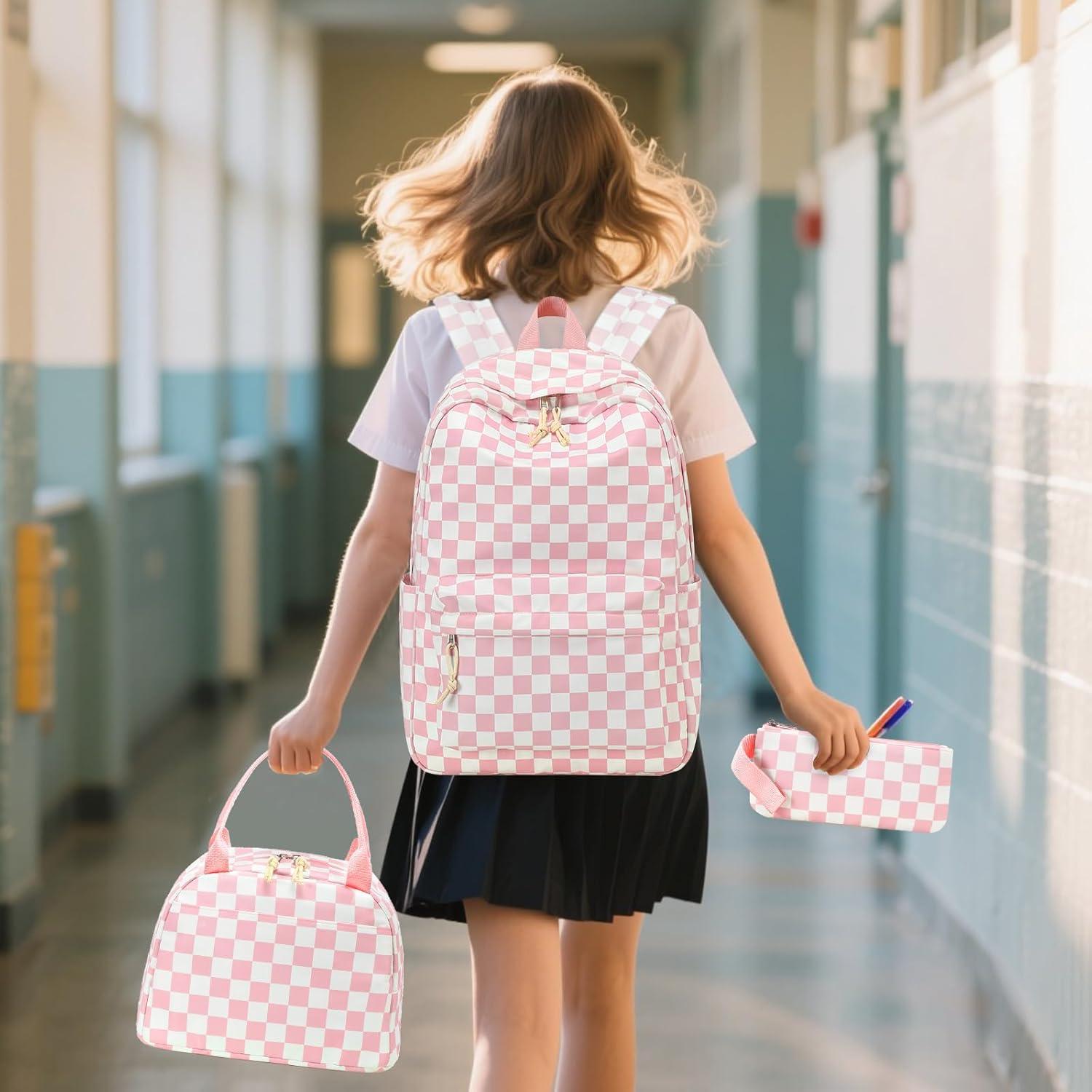 Bluboon Teen Girls School Backpack Kids Bookbag Set with Lunch Box Pencil Case Travel Laptop Backpack Casual Daypacks (Marble Pink-Blue)(Pink White Checkered)