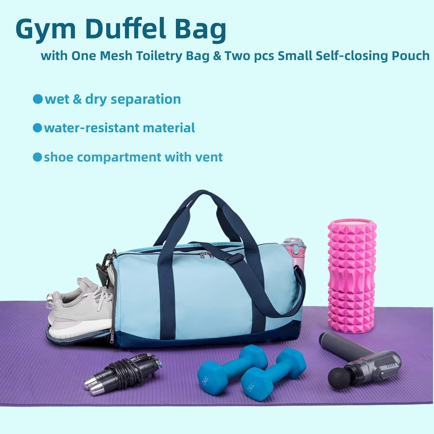 Gym bag with shoe compartment to keep your sneakers and dirty gear separated, as well a zipped plastic wet pocket for bathing suits or travel toiletries