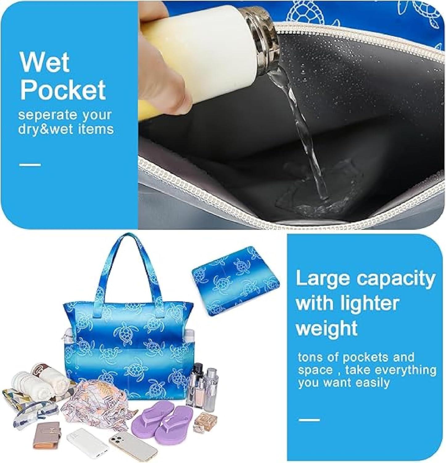 Waterproof Beach Tote Pool Bags for Women Ladies Extra Large Gym Tote Carry On Bag With Wet Compartment for Weekender Travel(2 Pcs Beach Bag With Towel-turtle Blue)