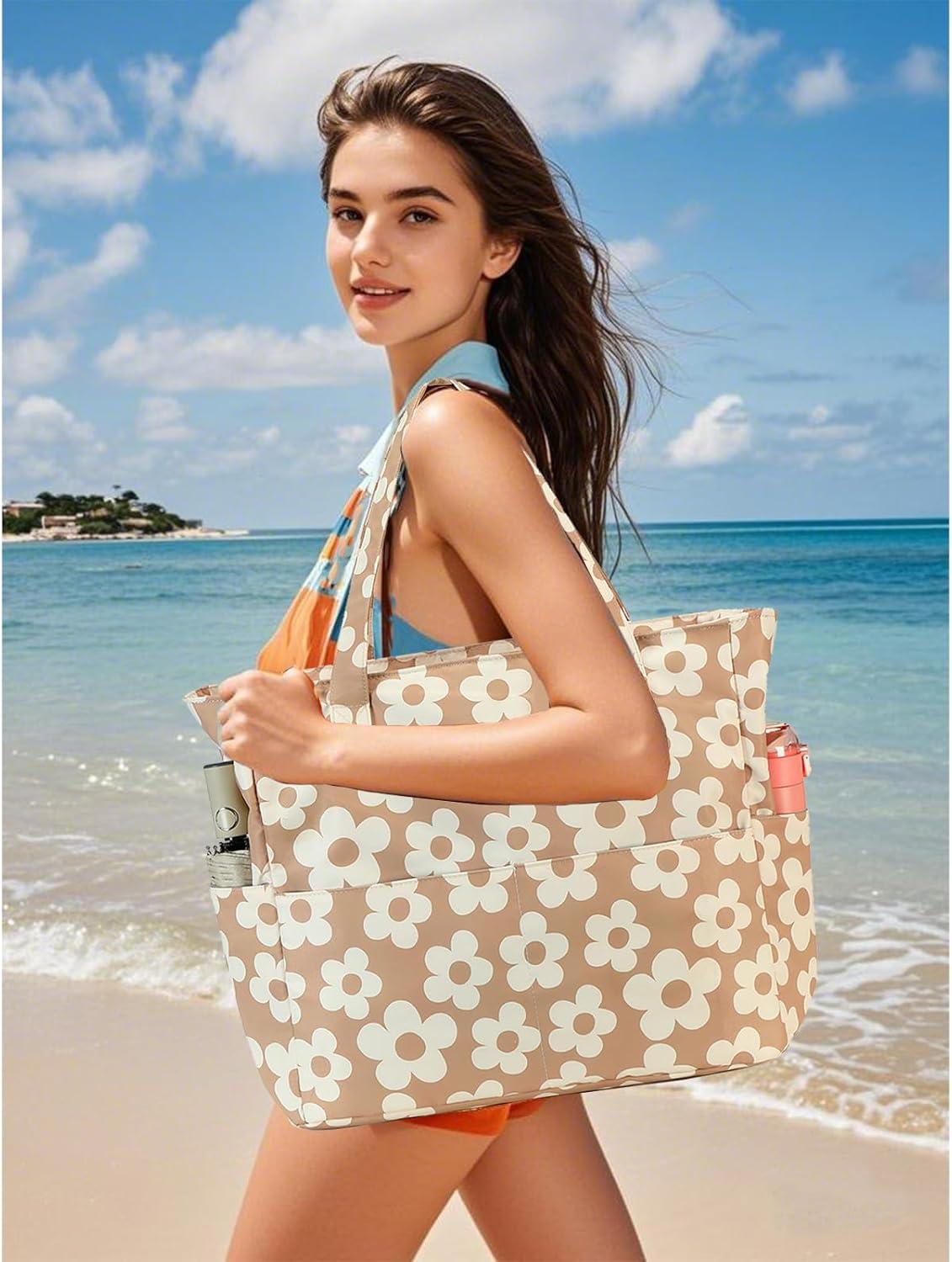 Waterproof Beach Tote Pool Bags for Women Ladies Extra Large Gym Tote Carry On Bag With Wet Compartment for Weekender Travel(Beige Floral 157)