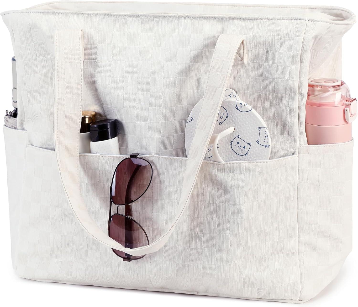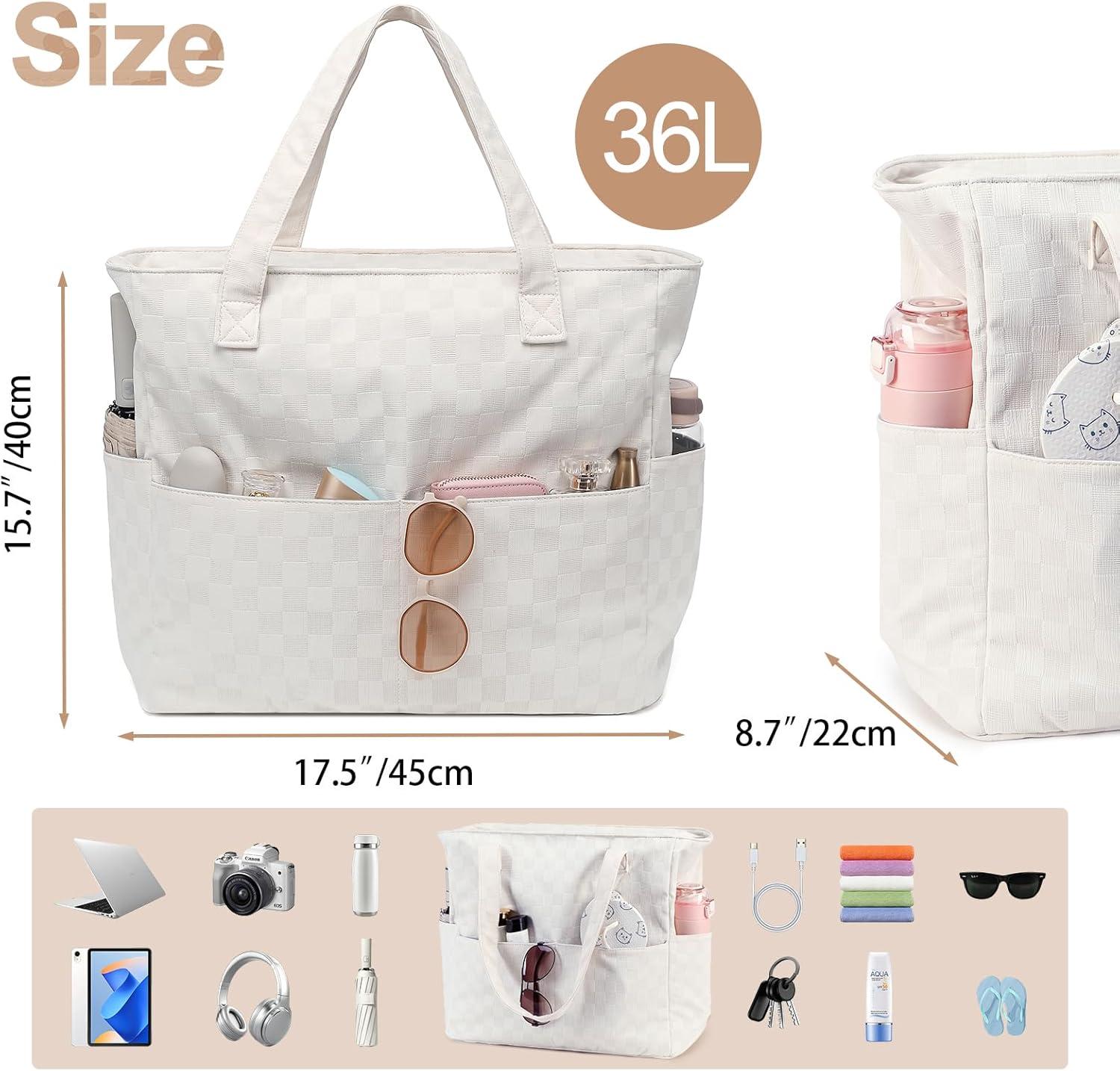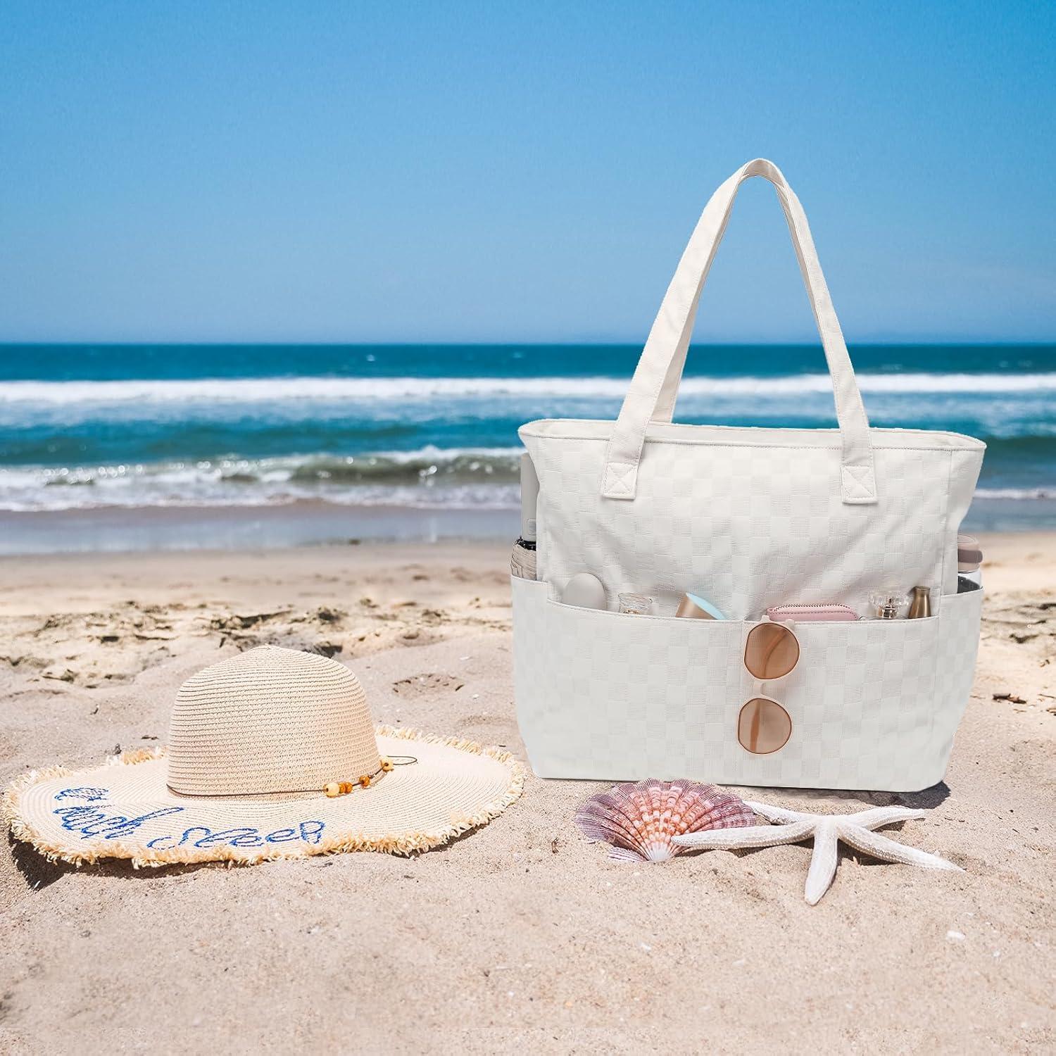 Waterproof Beach Tote Pool Bags for Women Ladies Extra Large Gym Tote Carry On Bag With Wet Compartment for Weekender Travel(Beige Grid)