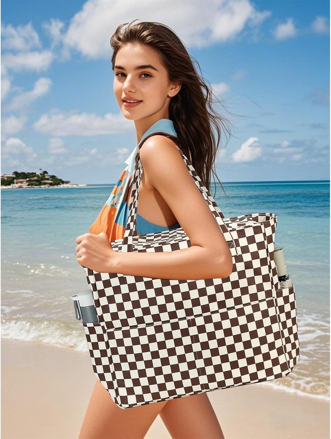 Waterproof Beach Tote Pool Bags for Women Ladies Extra Large Gym Tote Carry On Bag With Wet Compartment for Weekender Travel(Checked Brown Beige)
