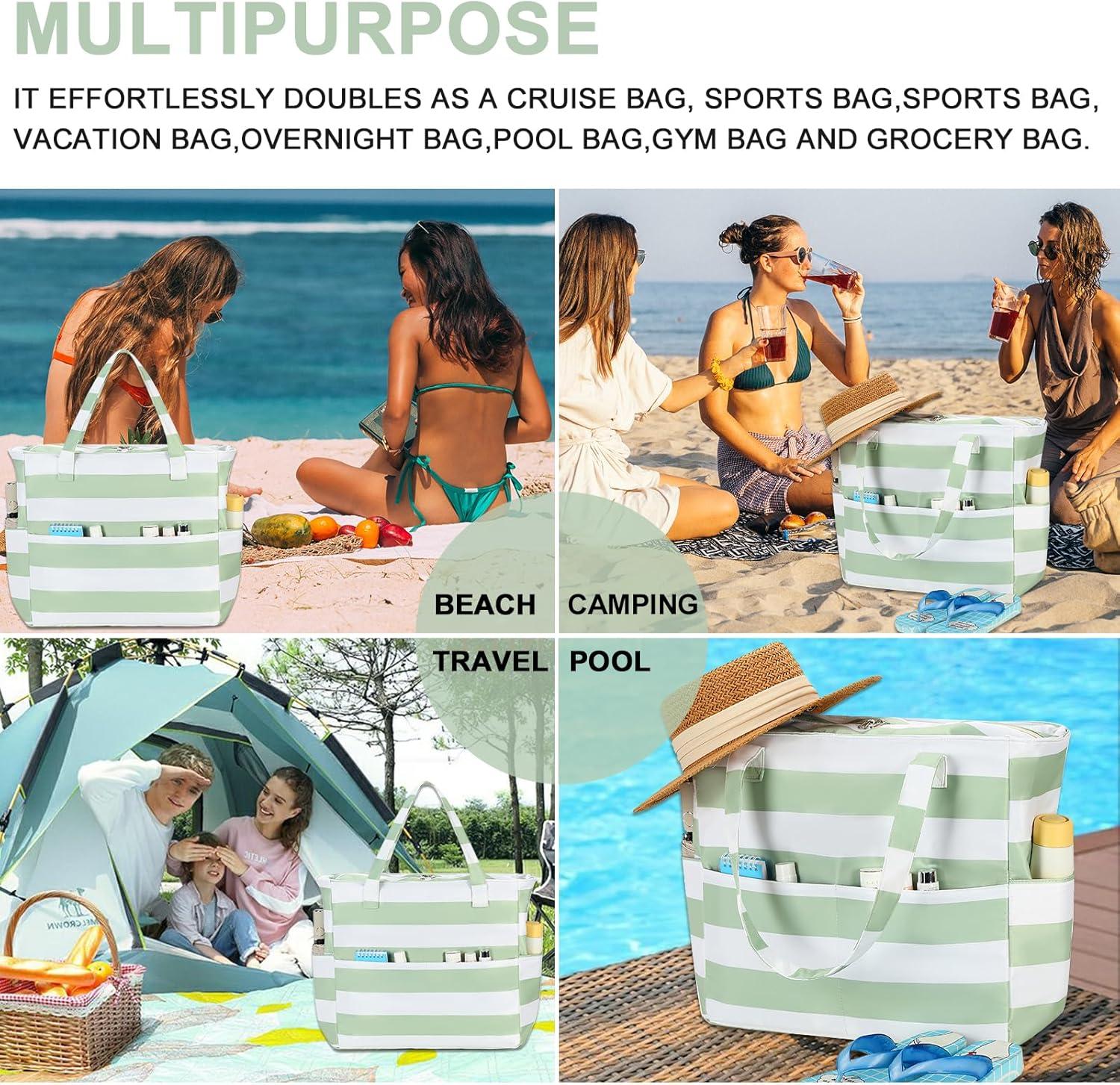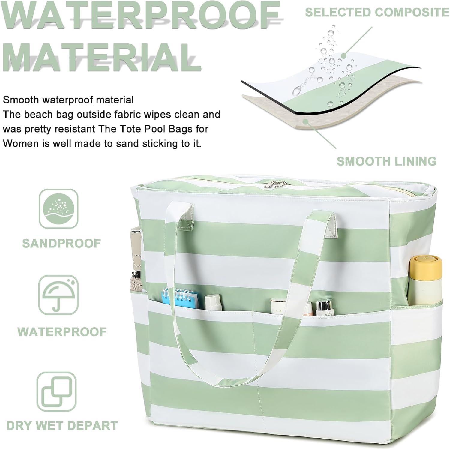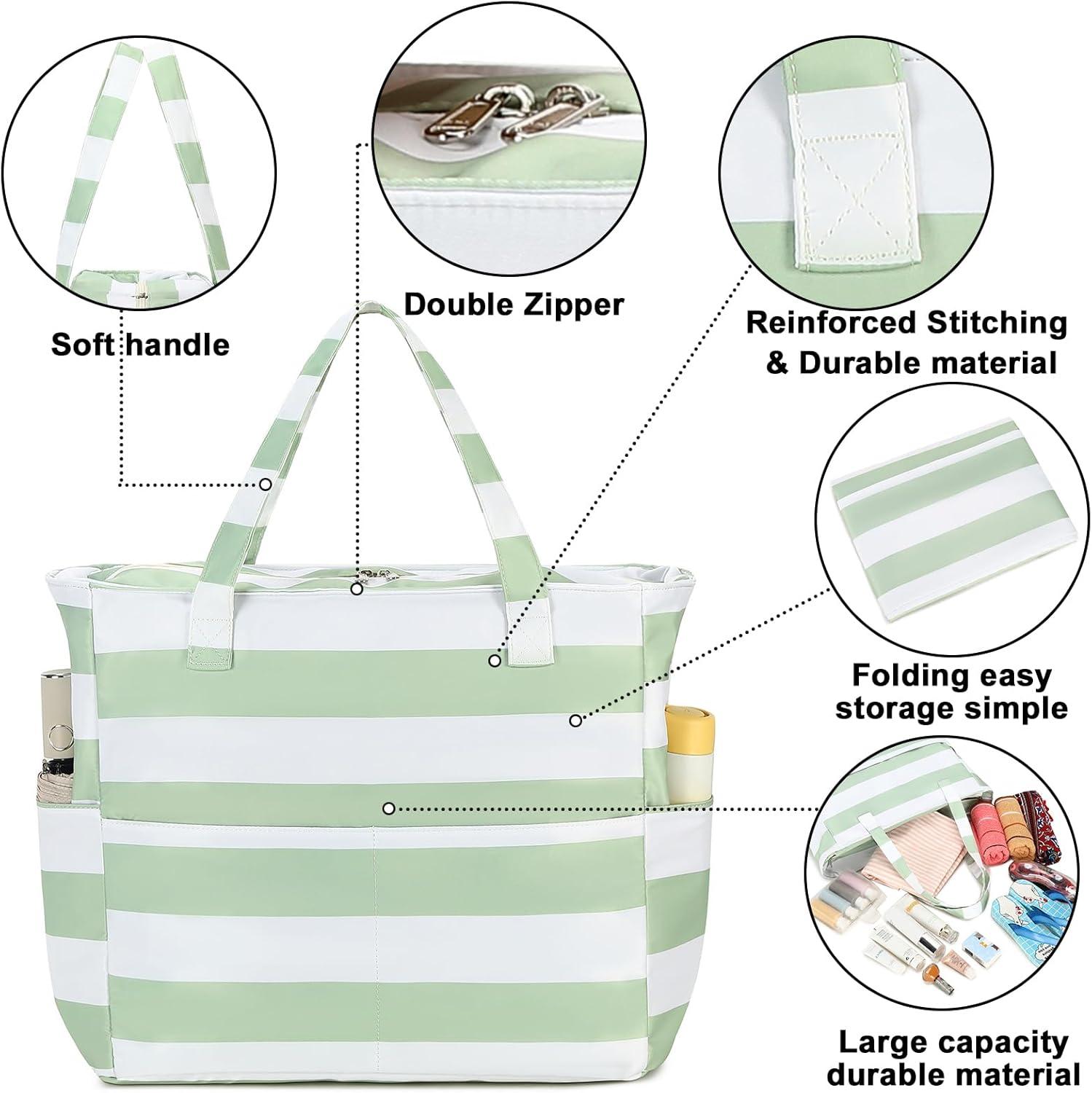Waterproof Beach Tote Pool Bags for Women Ladies Extra Large Gym Tote Carry On Bag With Wet Compartment for Weekender Travel(Sage Green Stripe)