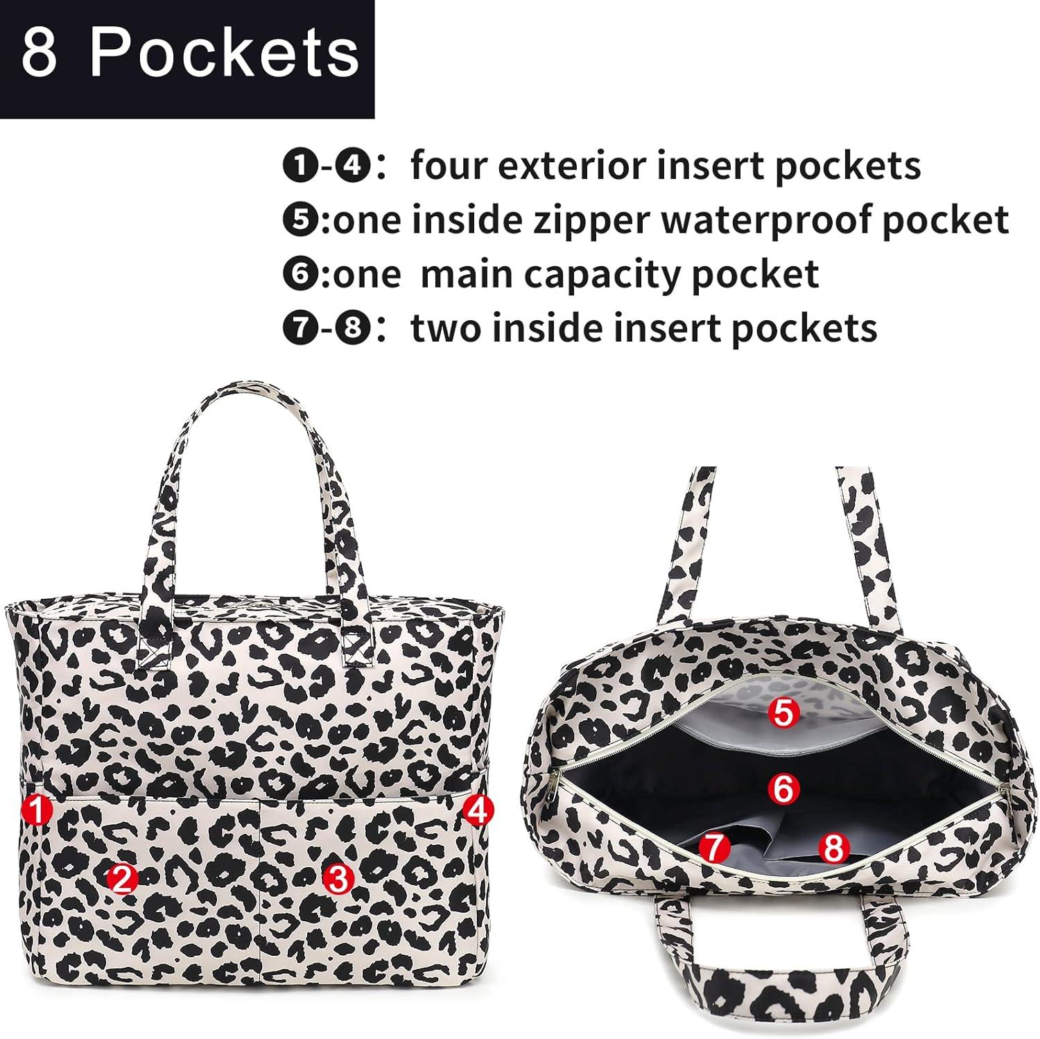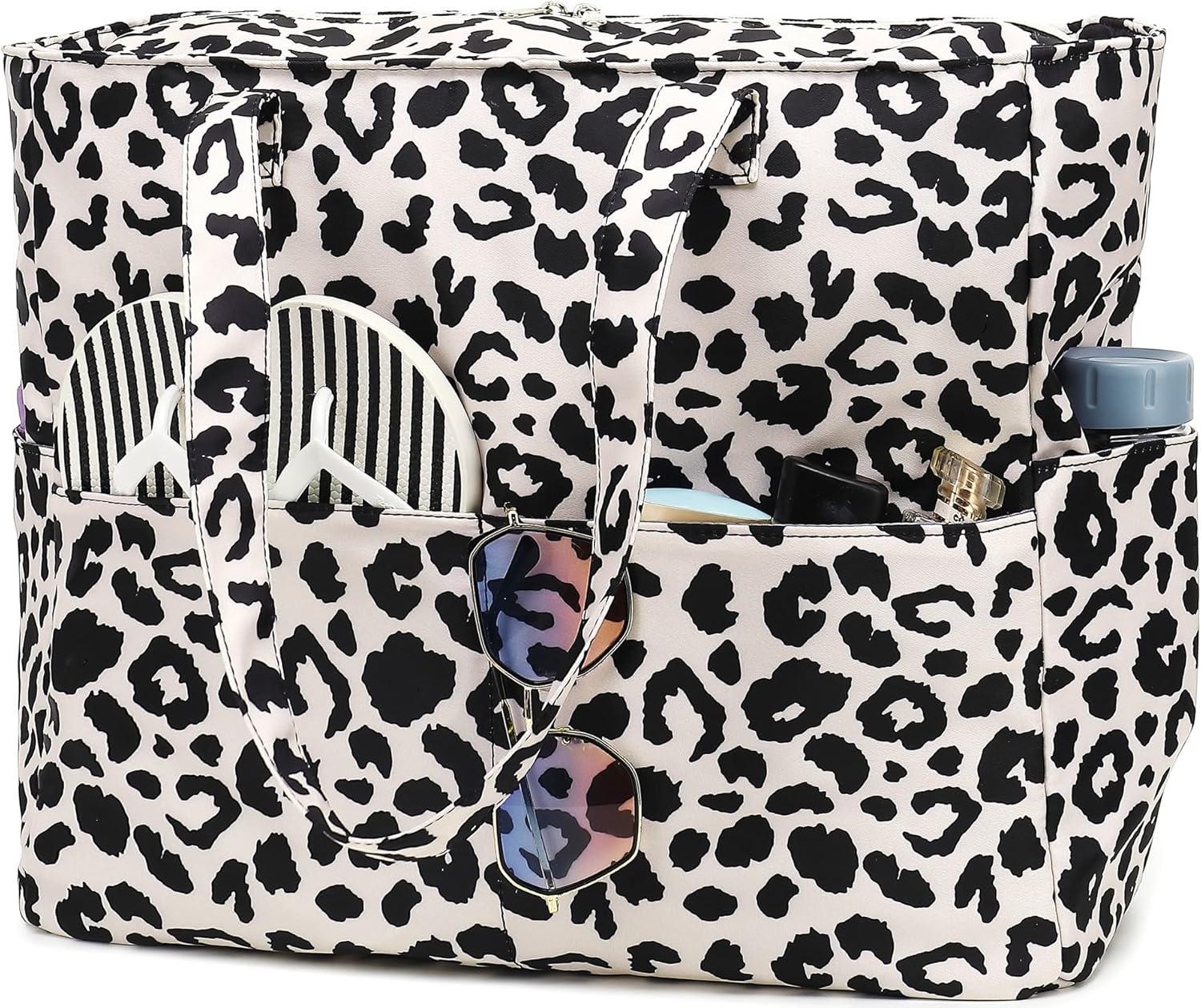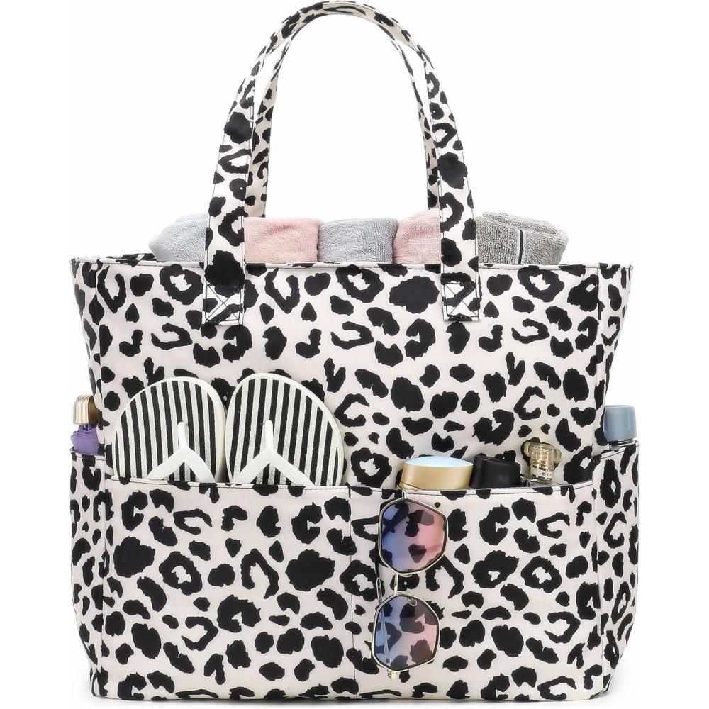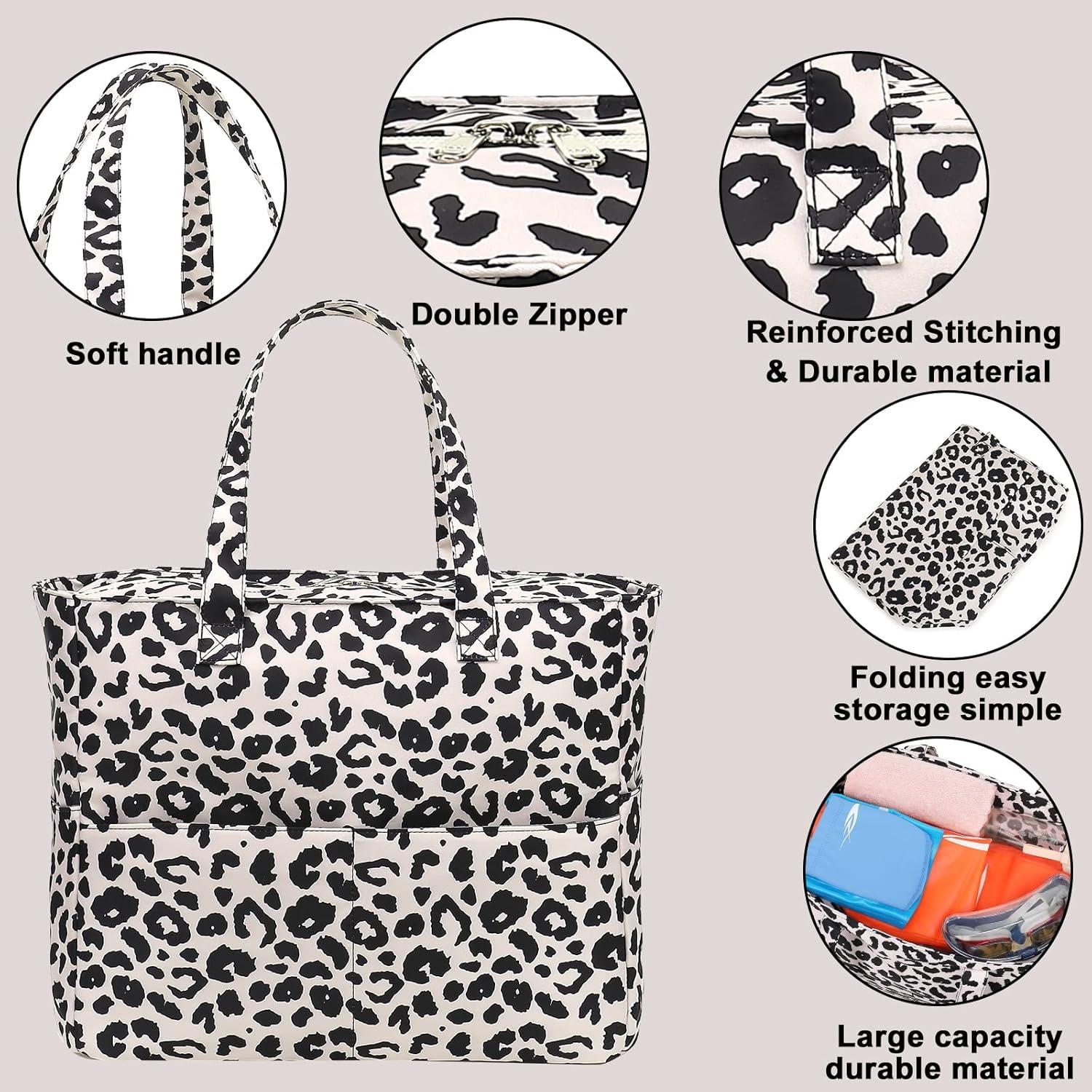 Waterproof Beach Tote Pool Bags for Women Ladies Extra Large Gym Tote Carry On Bag With Wet Compartment for Weekender Travel(W-black Leopard)